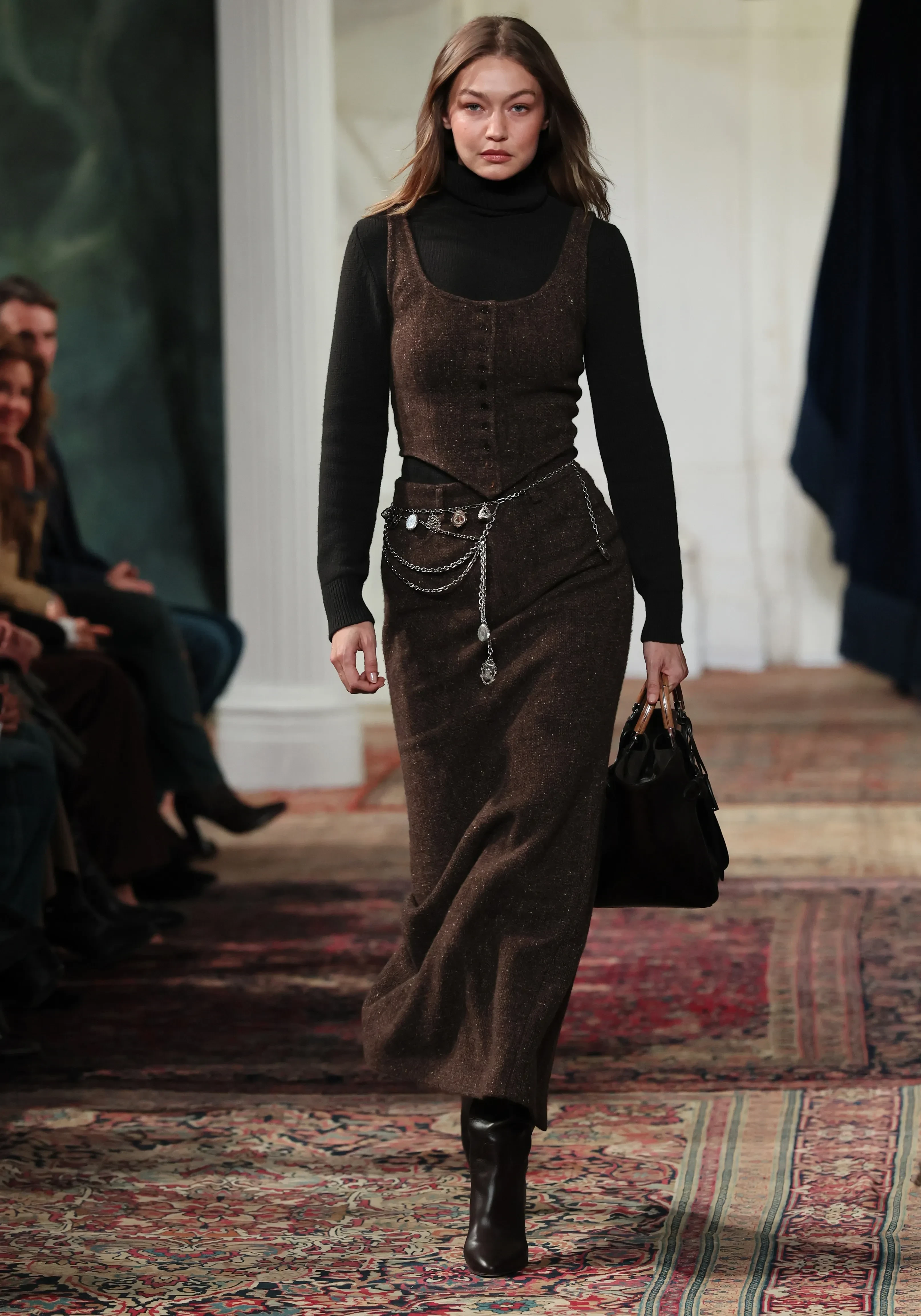 Леони ХаннеНа подиум на показе новой осенне-зимней коллекции Ralph Lauren вышли: 30-летняя супермодель Джиджи Хадид, звезда подиумов нулевых, 38-летняя Влада Рослякова, и многие другие. 86-летний основатель бренда и дизайнер Ральф Лорен вышел на поклон после шоу вместе с супругой Рики.