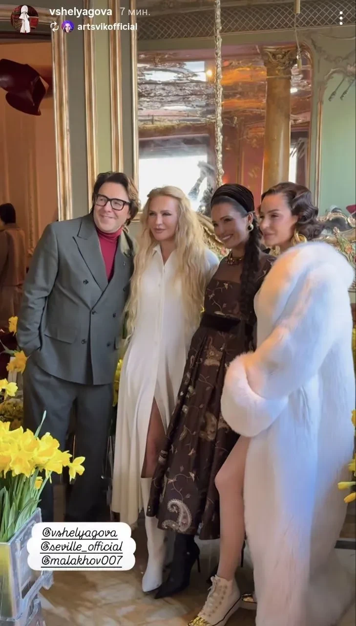 Блины, казачий хор и "жёлтый" дресс-код: Яна Рудковская, Андрей Малахов, Кристина Потупчик на Масленице Виктории Шеляговой в Savoy
