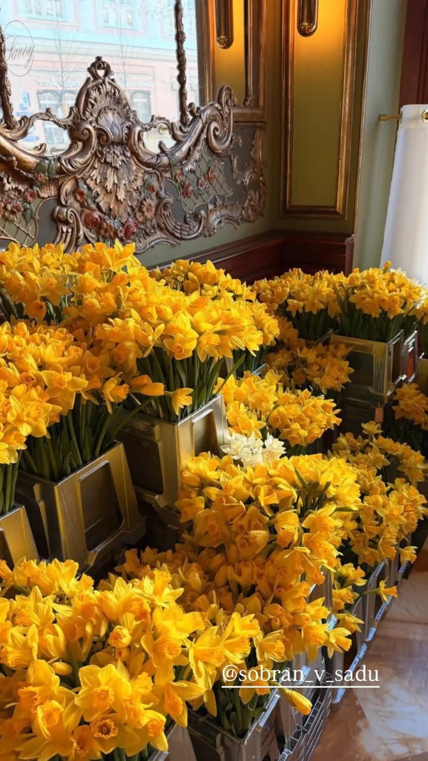 Хозяйка праздника, которая лишь недавно сделала пластическую операцию, появилась перед гостями с внучкой. Присутствующих, для которых был объявлен "жёлто-белый" дресс-код, угощали блинами, их развлекал казачий хор. Пространство было украшено живыми нарциссами.