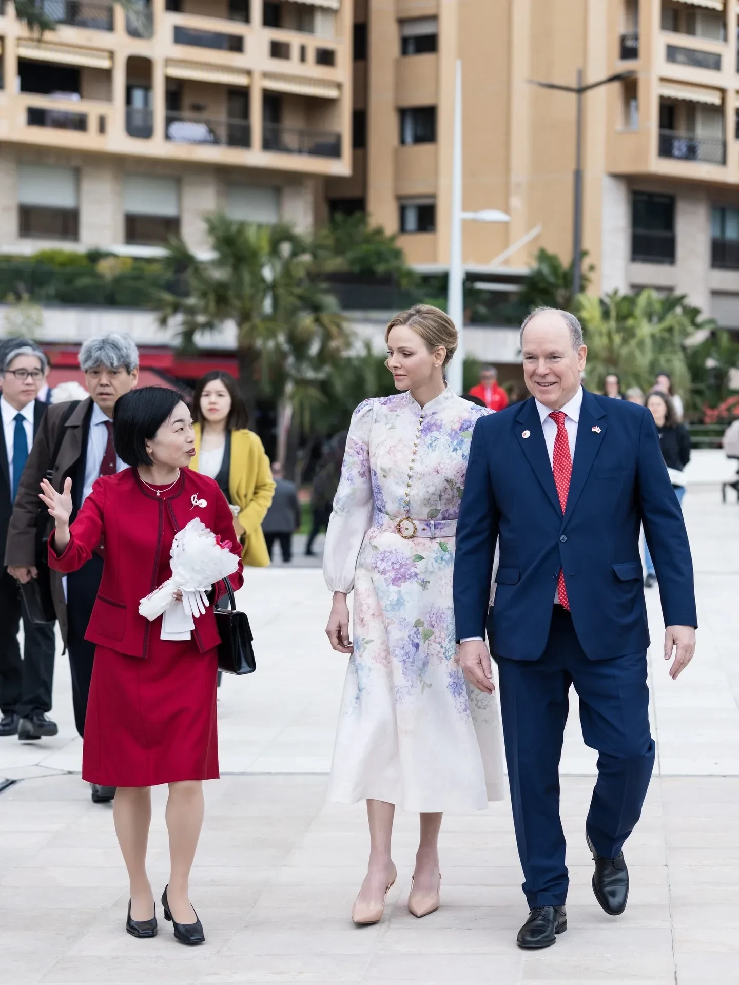 Сначала пара отправилась на площадку рядом с Форумом Гримальди, где в сопровождении японской принцессы Акико Микасы дала старт "Японии в Монако" — мероприятию, посвящённому 20-летию дипломатических отношений между княжеством и Японией. 48-летняя Шарлен появилась на публике в светлом платье Zimmermann с цветочным принтом и воротником-стойкой, а 68-летний Альбер был в классическом синем костюме.