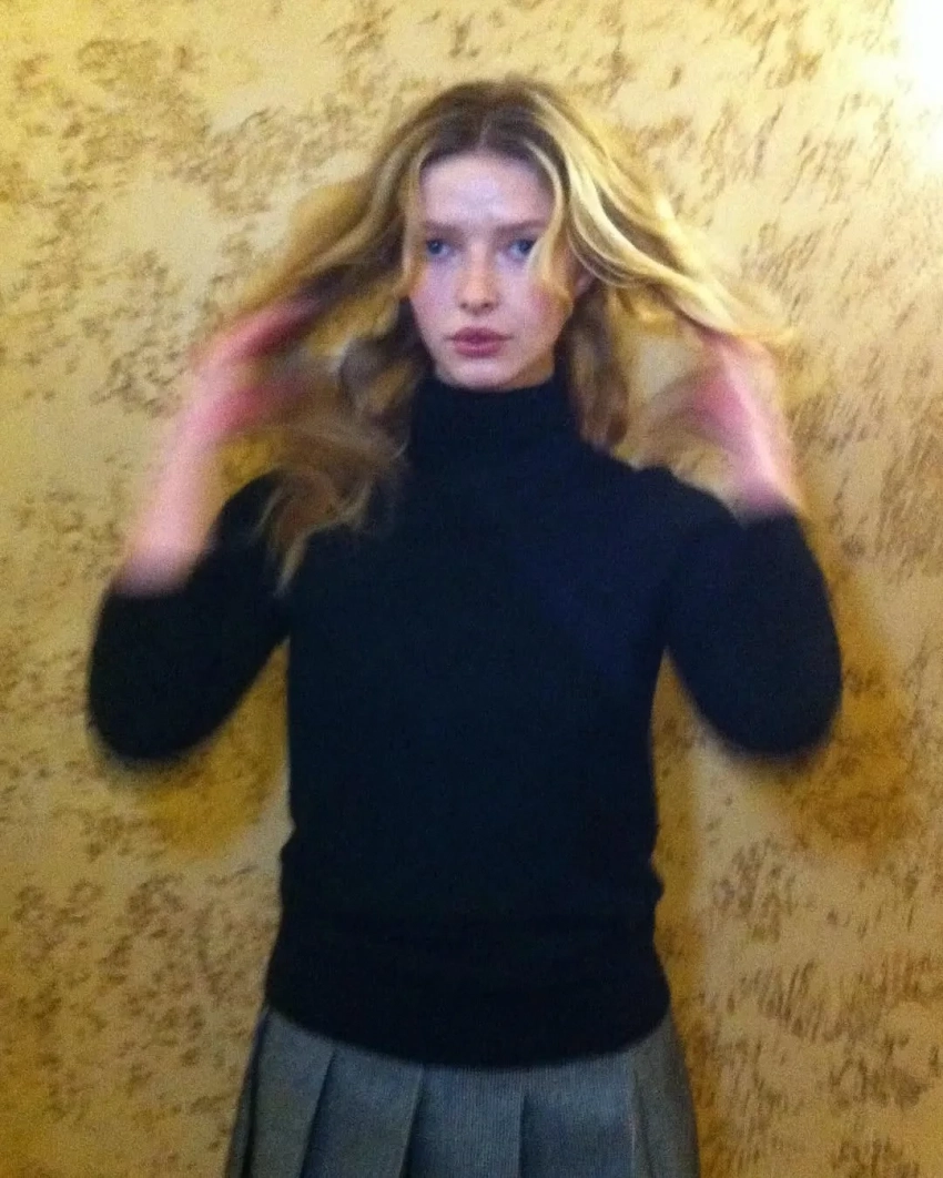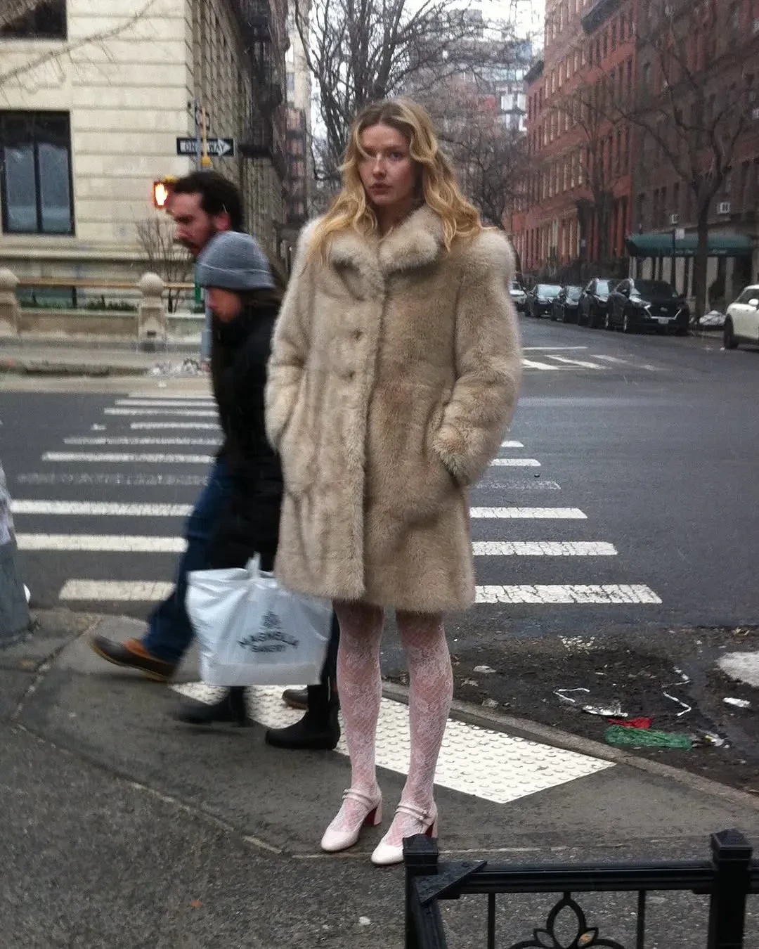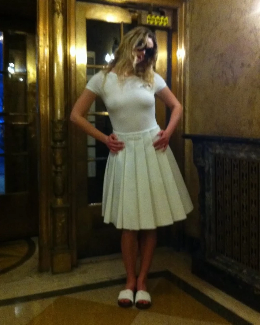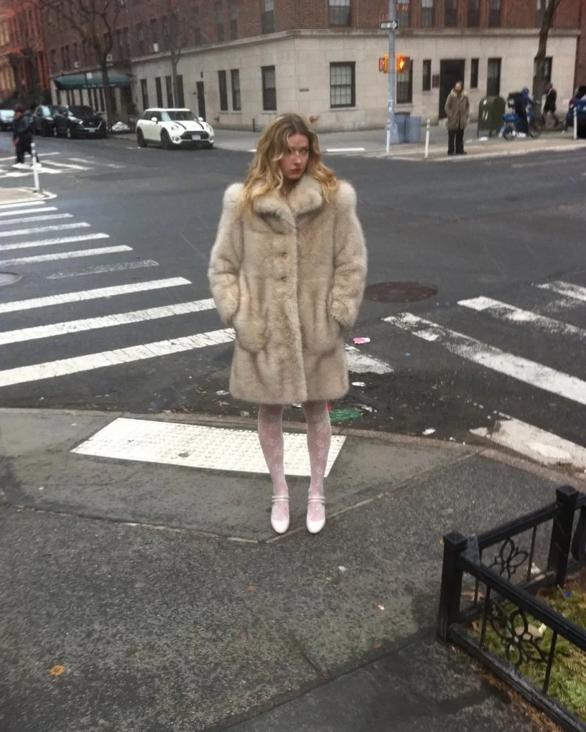 На снимках дочь солиста группы Coldplay Криса Мартина и актриса позирует на улицах Нью-Йорка в бежевой шубе и кружевных белых колготках и в помещении — в чёрной водолазке, кружевном топе и белой теннисной юбке с футболкой.