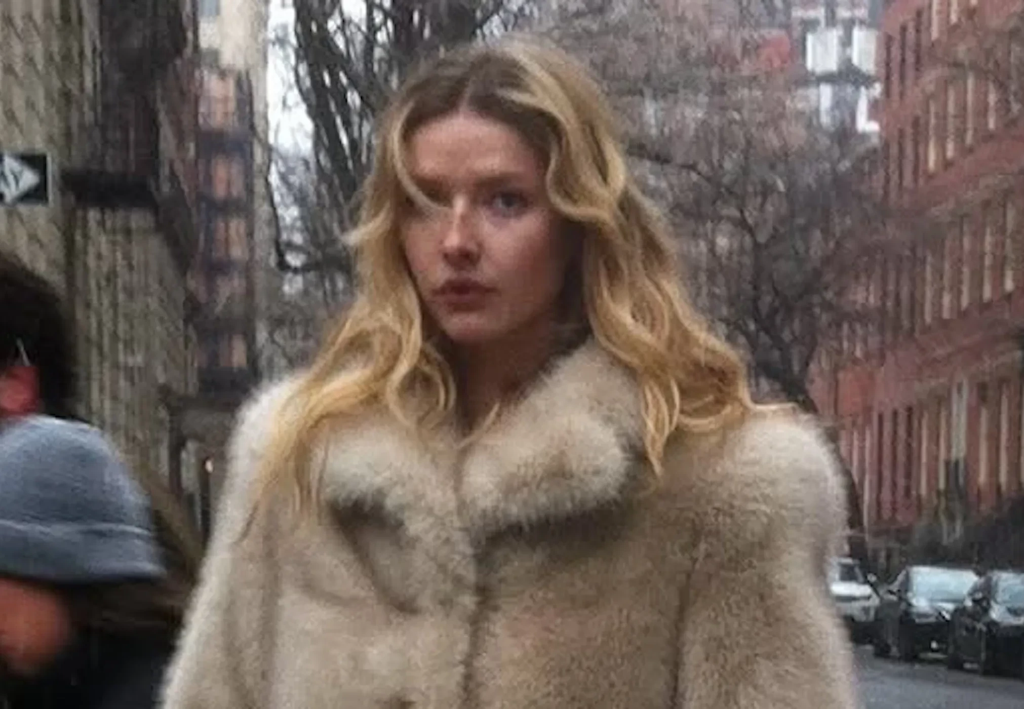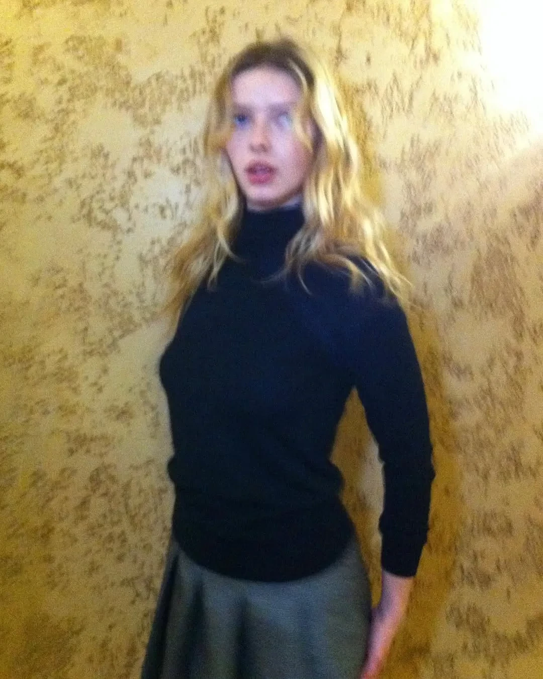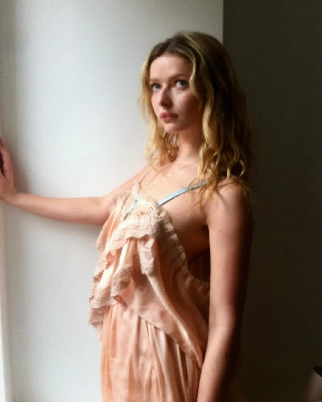 На снимках дочь солиста группы Coldplay Криса Мартина и актриса позирует на улицах Нью-Йорка в бежевой шубе и кружевных белых колготках и в помещении — в чёрной водолазке, кружевном топе и белой теннисной юбке с футболкой.