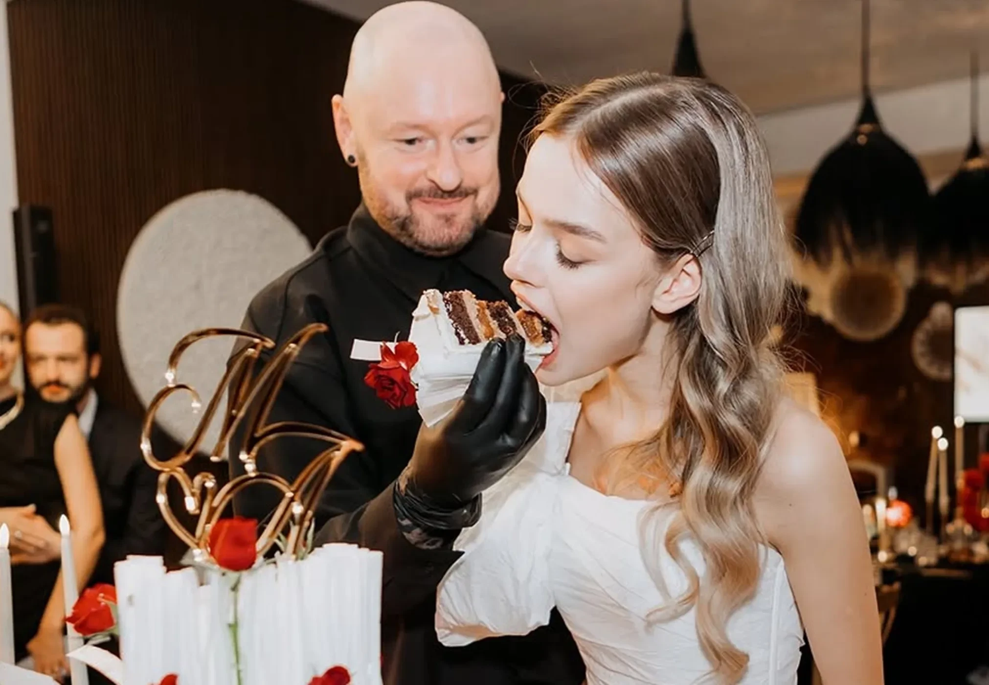На снимках они с Горобцом предстали в классических свадебных нарядах, при этом актриса отказалась от каблуков, предпочтя им кеды с анималистическим принтом. Молодожёнам вынесли многоярусный торт, невесту поздравили её мама и многочисленные гости.