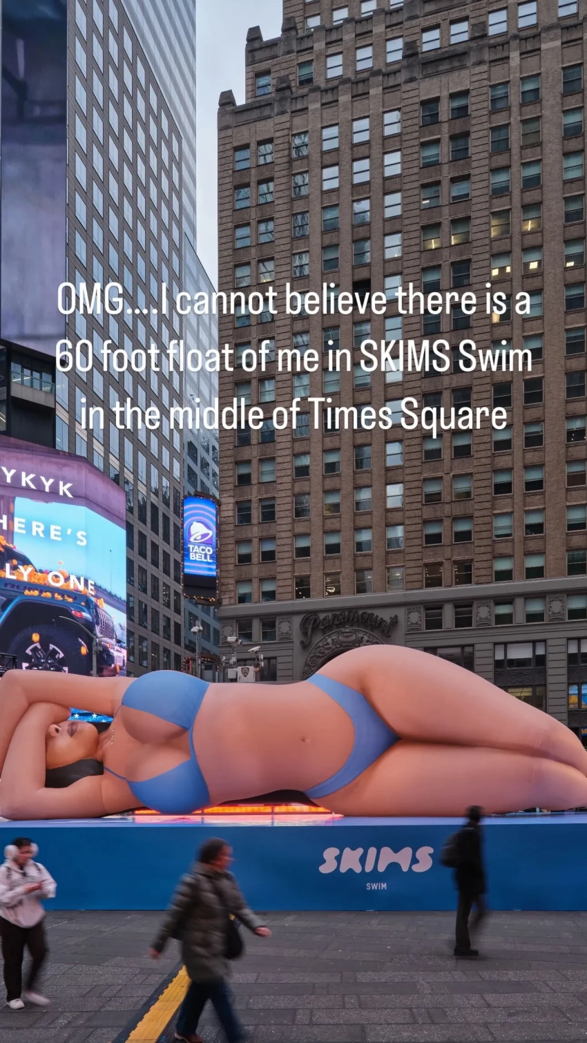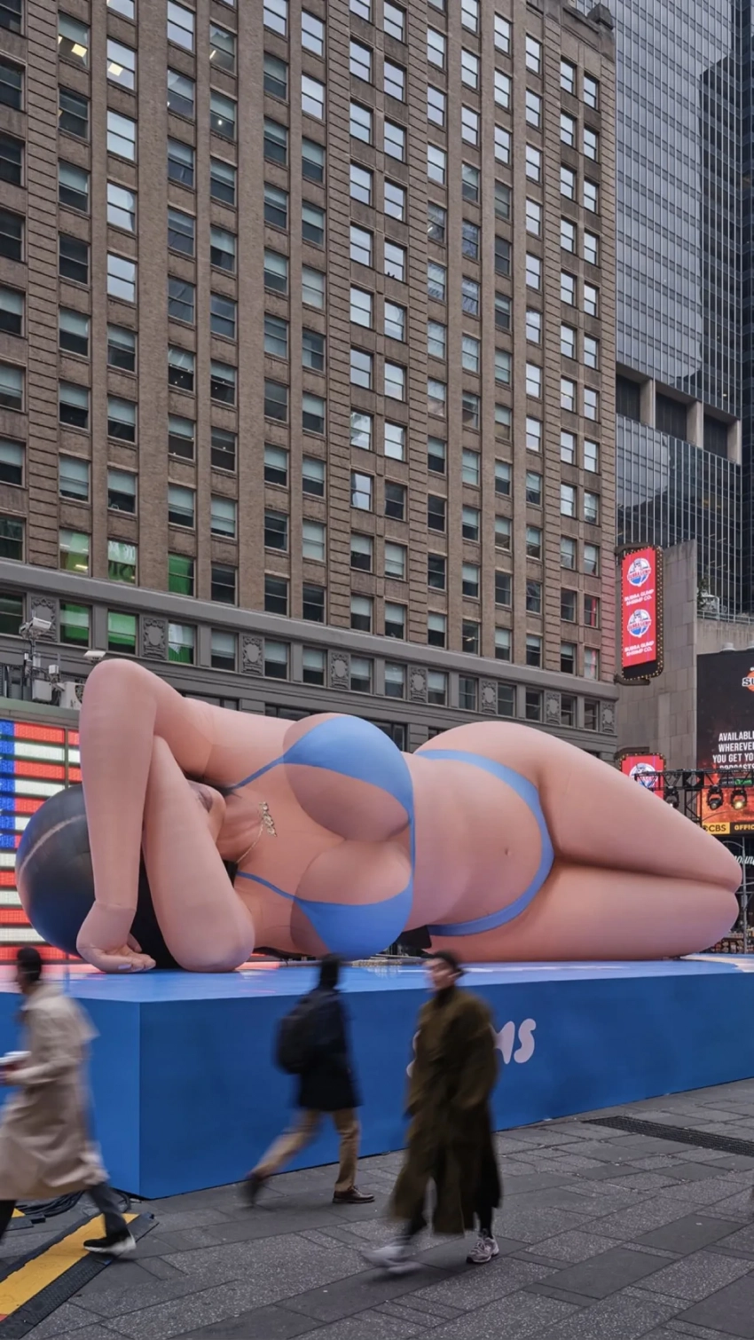 Ким Кардашьян разместила свою 18-метровую копию в центре Таймс-сквер в честь новой коллекции купальников своего бренда Skims. Концепцию разработала Эми Куле из креативного агентства Merry Wonderer.