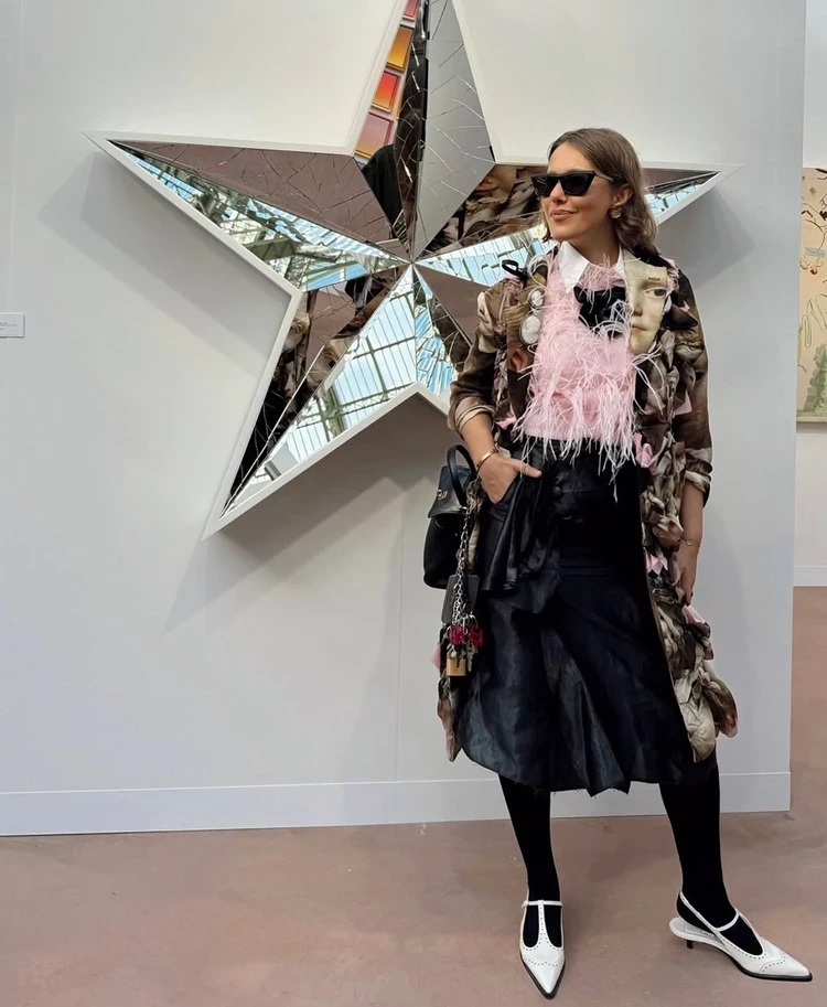 Любительница сложных образов и перьев Ксения Собчак собрала очередной «навороченный» лук с пастельно-розовым джемпером с черным бантом. Его она сочетала с белой рубашкой, черный юбкой и трендовыми слингбэками от Miu Miu. А сверху накинула пестрое пальто со сборками. Вещь, безусловно, оригинальная и даже розовые вкрапления имеются (в тон джемперу), но уж очень она утяжелила образ. Кажется, что черный кожаный тренч смотрелся бы куда уместнее.