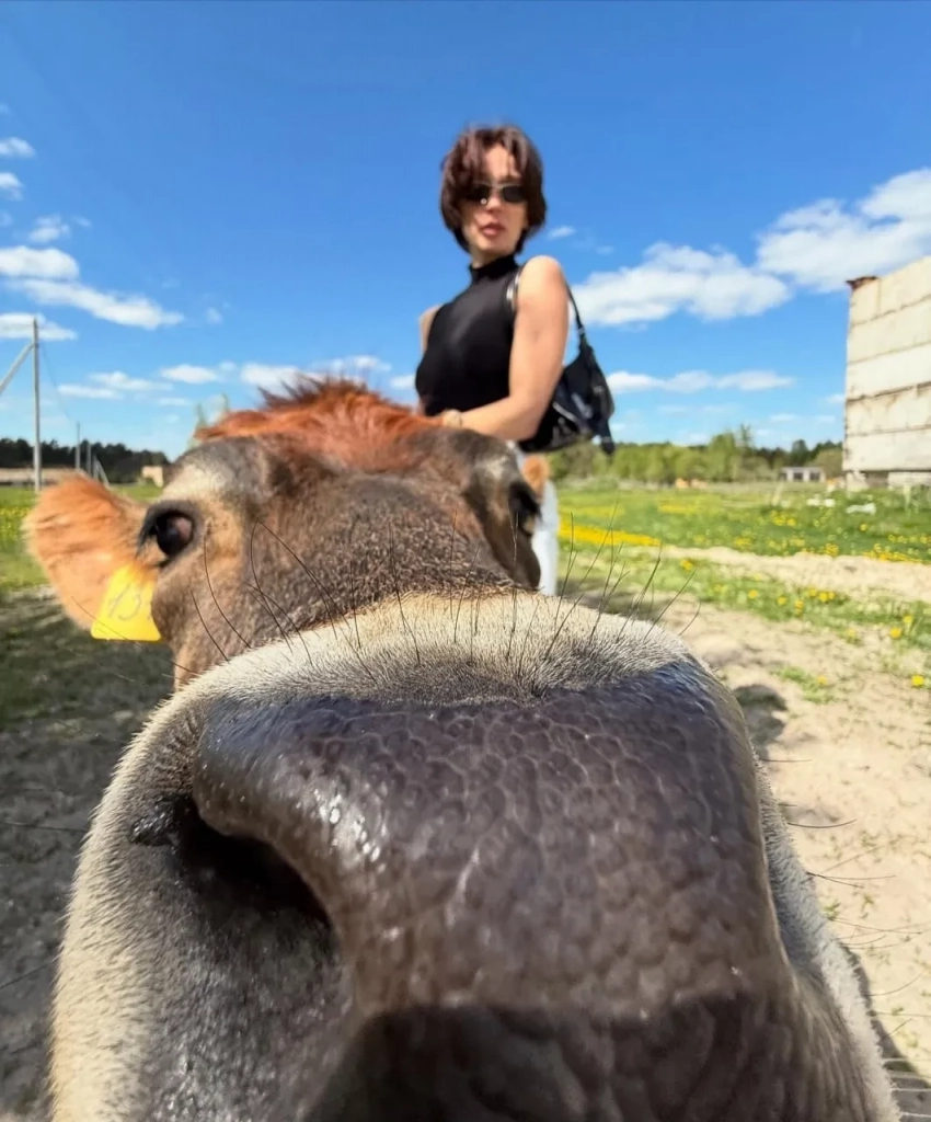 Так, на одном из снимков блогерша позирует, стоя перед трактором, а на другом — рядом с коровой.
