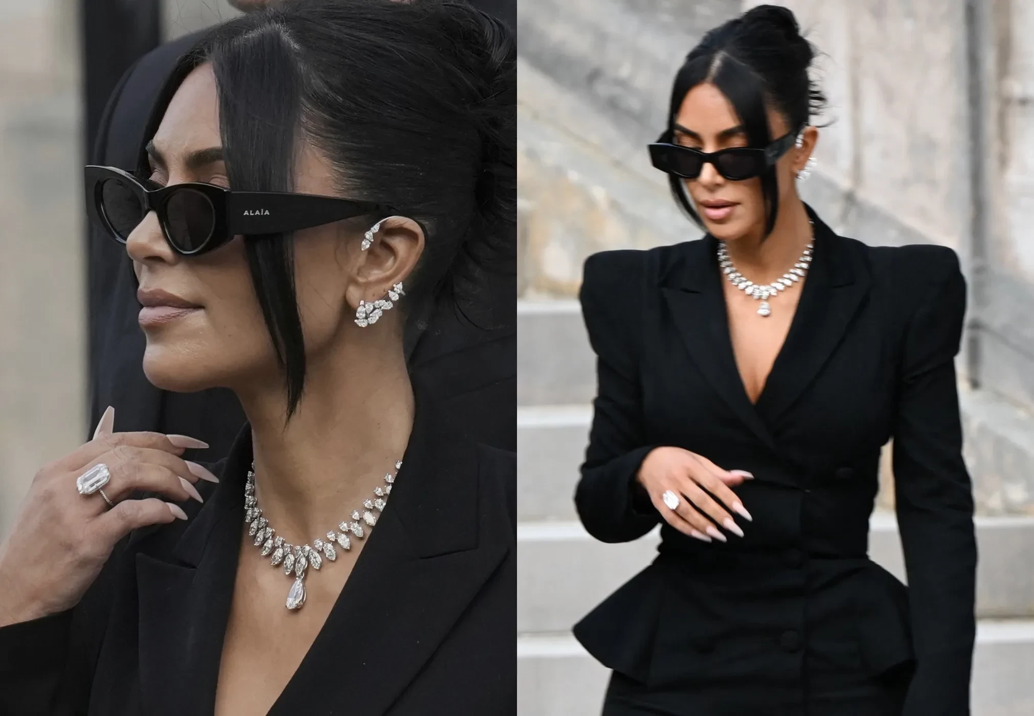 44-летняя экс-супруга Канье Уэста появилась на заседании в винтажном костюме John Galliano и туфлях Saint Laurent, но больше всего внимания привлекли её ювелирные украшения. Ким позировала папарацци около здания суда в бриллиантовом колье Samer Halimeh стоимостью 3 млн долларов. Изделие из 18-каратного белого золота украшают 80 бриллиантов и камень грушевидной формы в 10,13 карата. Общий вес ожерелья — 52,17 карата.