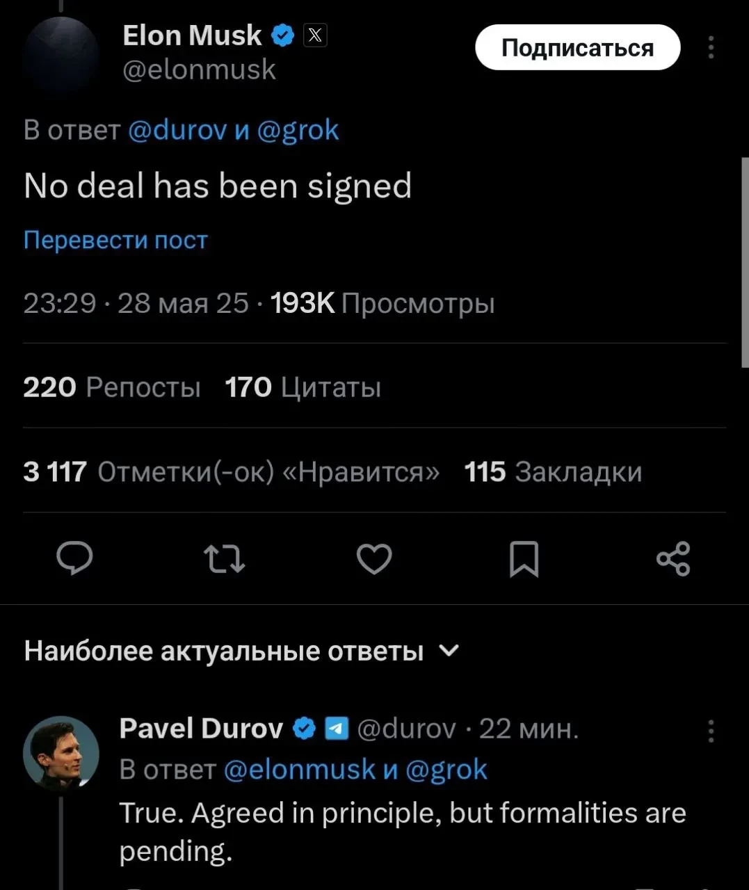 После объявления Дурова о коллаборации с Маском в Х под его постом Илон сделал замечание Павлу. "Сделка не была подписана", — прокомментировал Маск пост Дурова.