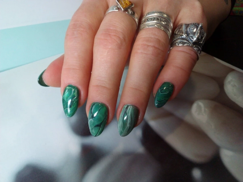 Если хочется чего-то по-настоящему выразительного и утонченного, попробуй мраморный маникюр в изумрудном оттенке. Такой дизайн выглядит дорого, артистично и идеально подходит для особых случаев. Добавь немного золотого или черного для глубины — и твои ногти превратятся в маленькие произведения искусства.